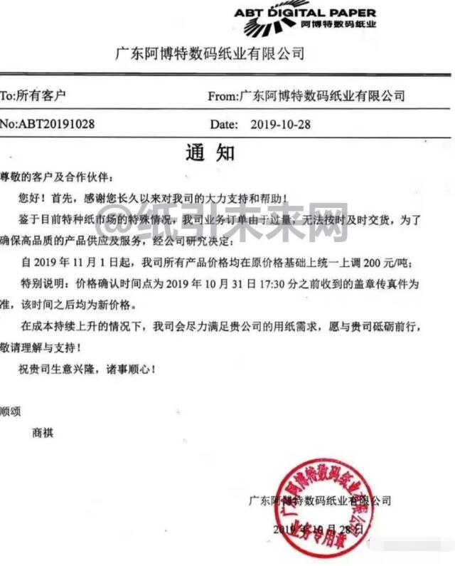廣東阿博特?cái)?shù)碼紙業(yè)有限公司:鑒于目前特種紙市場(chǎng)的特殊情況,自2019年11月1日起,我司所有產(chǎn)品價(jià)格均在原價(jià)格基礎(chǔ)上統(tǒng)一上調(diào)200元/噸。