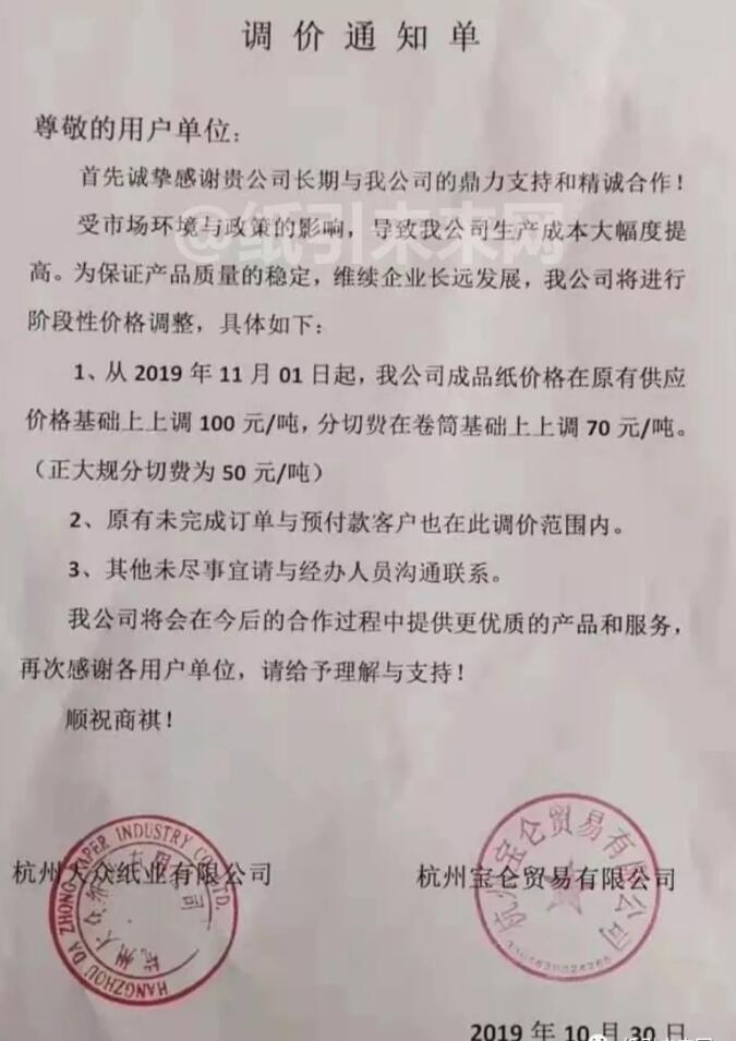 杭州大眾紙業(yè):受市場(chǎng)環(huán)境與政策的影響,我司將進(jìn)行階段性價(jià)格調(diào)整,具體如下:從2019年11月01日起,我公司成品紙價(jià)格在原有供應(yīng)價(jià)格基礎(chǔ)上上調(diào)100元/噸,分切費(fèi)在卷筒基礎(chǔ)上上調(diào)70元/噸。(正大規(guī)分切費(fèi)為50元/噸)