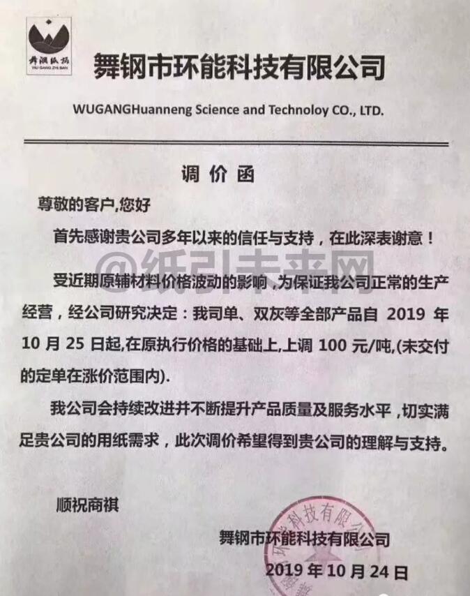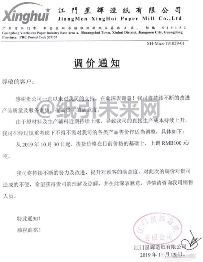湖北長(zhǎng)江匯豐紙業(yè):因近期原材料上漲,特向廣大用戶作如下通知并敬請(qǐng)理解:從2019年11月1日起,我司單面涂布,白板紙?jiān)谀壳皟r(jià)格基礎(chǔ)上上調(diào)100元/噸。 江門星輝造紙有限公司:由于原材料及生產(chǎn)輔料近期持續(xù)上漲,從2019年10月30日起,提貨價(jià)格在目前價(jià)格的基礎(chǔ)上,上調(diào)RMB100元/噸。