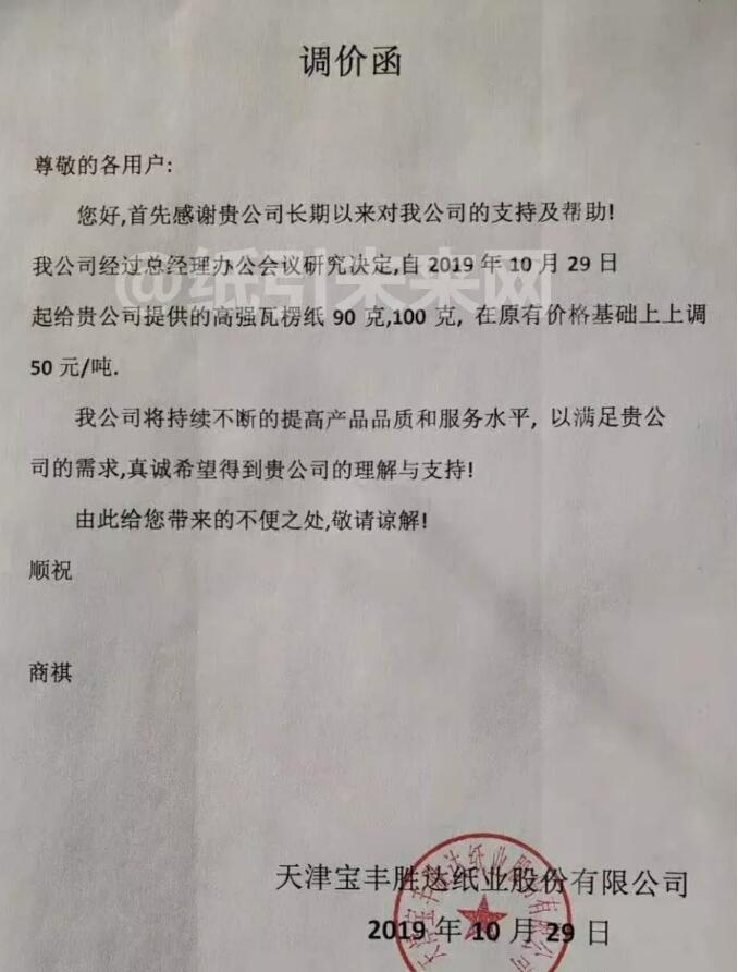 天津?qū)氊S勝達(dá)紙業(yè):我公司經(jīng)過(guò)總經(jīng)理辦公會(huì)議研究決定,自2019年10月29日是起給貴公司提供的高強(qiáng)瓦楞紙90克,100克,在原有價(jià)格基礎(chǔ)上上調(diào)50元/噸。