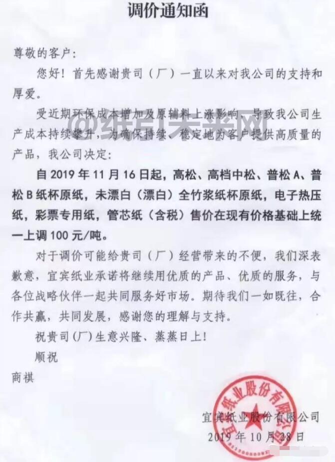 宜賓紙業(yè):受近期環(huán)保成本增加及原輔料上漲影響,導(dǎo)致我公司生產(chǎn)成本持續(xù)攀升,為確保持續(xù)、穩(wěn)定地為客戶提供高質(zhì)量的產(chǎn)品,我公司決定:自2019年11月16日起,高松、高檔中松、普松A、普松B紙杯原紙,未漂白(漂白)全竹漿紙杯原紙,電子熱壓紙,彩票專用紙,管芯紙(含稅)售價(jià)在現(xiàn)有價(jià)格基礎(chǔ)上統(tǒng)一上調(diào)100元/噸。