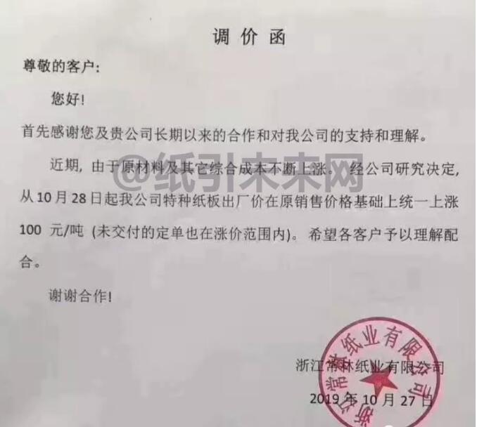 浙江常林紙業(yè):由于原材料及其他綜合成本不斷上漲,經(jīng)公司研究決定,從10月28日起我公司特種紙板出廠價(jià)基礎(chǔ)上統(tǒng)一上漲100元/噸(未交付的定單也在漲價(jià)范圍內(nèi))。