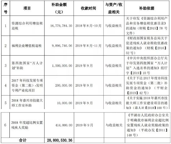 11月5日,浙江榮晟環保紙業股份有限公司發布公告稱,2019年8月7日至公告日,浙江榮晟環保紙業股份有限公司及子公司累計收到政府補助約人民幣 2880萬元(詳見下表),其中與收益相關的各類政府補助約人民幣 2880萬元。