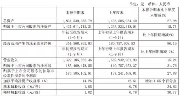 根據榮晟環保三季報,公司前三季度凈利潤1.85億元,同比增長31.76%;營業收入13.22億元,同比減少15.24%;基本每股收益1.05元,同比增長34.62%。