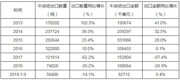 根據中國海關數據顯示:2019年1-9月中國牛皮紙出口數量為50406噸,同比下降14.1%;2019年1-9月中國牛皮紙出口金額為82712千美元,同比增長9.4%。