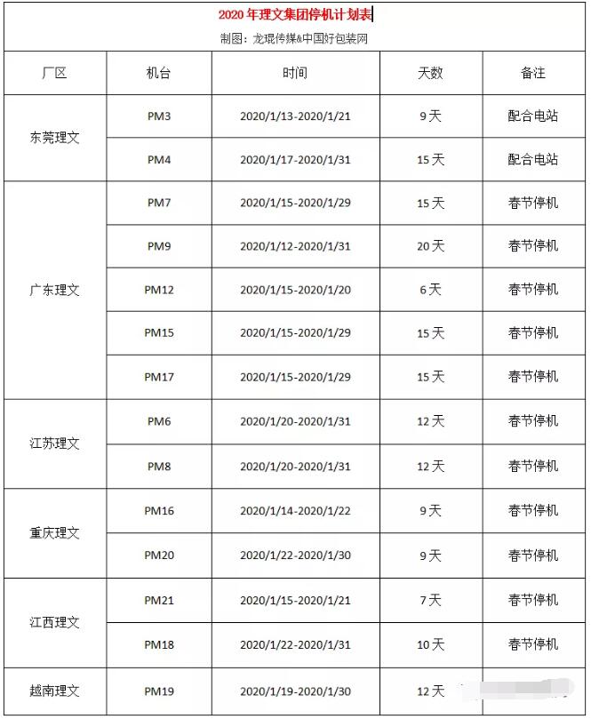 11月5日,理文造紙公布了2020年集團停機計劃表,六大基地共計14臺紙機將從2020年1月12日-2020年1月31日期間陸續(xù)停機,各機臺停機時長為6-15天不等。