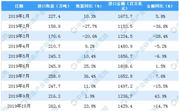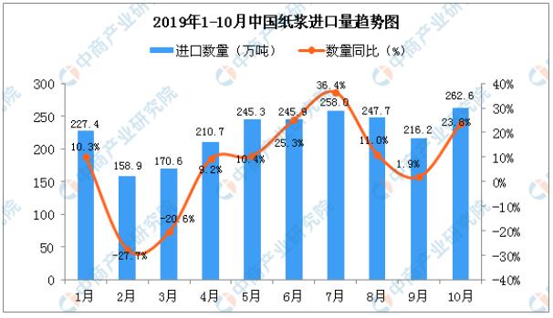 據(jù)中商產(chǎn)業(yè)研究院數(shù)據(jù)庫顯示,2019年1-3季度中國紙漿進口量逐漸增長,增長29.63%。2019年10月中國紙漿進口量為262.6萬噸,同比增長23.8%。