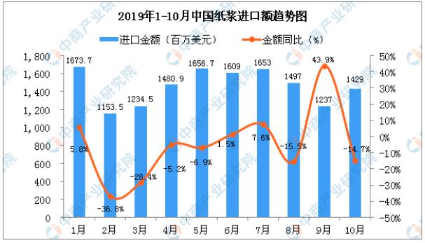 從金額方面來看,2019年10月中國紙漿進口金額為1429百萬美元,同比下降14.7%。