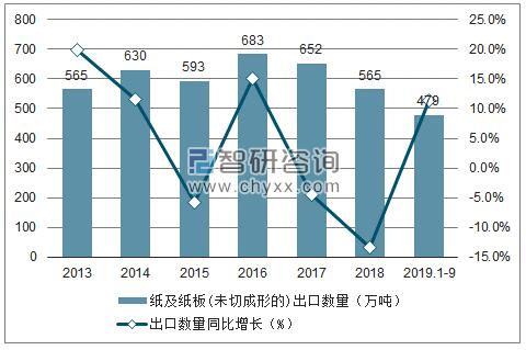 根據中國海關數據顯示:2019年1-9月中國紙及紙板(未切成形的)出口數量為479萬噸,同比增長11.4%;2019年1-9月中國紙及紙板(未切成形的)出口金額為6015238千美元,同比增長15.2%。