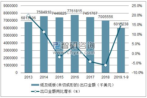 2013-2019年9月中國紙及紙板(未切成形的)出口金額趨勢圖