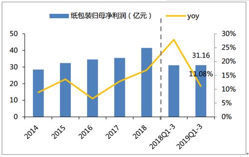 數(shù)據(jù)來(lái)源:公共資料整理 紙包裝2014-2019Q3歸母凈利潤(rùn)(億元)及增速