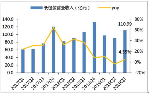數(shù)據(jù)來(lái)源:公共資料整理 2019Q1-3紙包裝板塊實(shí)現(xiàn)營(yíng)業(yè)收入306.01億元,同比+3.64%;實(shí)現(xiàn)歸母凈利潤(rùn)31.16億元,同比+11.08%。 紙包裝2014-2019Q3營(yíng)收(億元)及增速