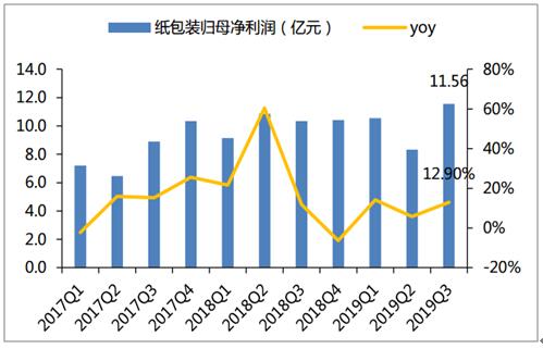 數(shù)據(jù)來(lái)源:公共資料整理 紙包裝版塊2017-2019Q3歸母凈利潤(rùn)(億元)及增速