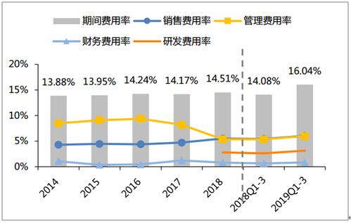 數(shù)據(jù)來(lái)源:公共資料整理 2019Q1-3紙包裝子版塊毛利率同比+2.17pcpts至28.06%,凈利率同比-0.80pcpts至10.69%。期間費(fèi)用率同比+1.95pcpts至16.04%,其中銷售費(fèi)用率同比+0.62pcpts至6.06%;管理費(fèi)用率同比+0.64pcpts至5.99%;財(cái)務(wù)費(fèi)用率同比+0.17pcpts至0.84pcpts;研發(fā)費(fèi)用率同比+0.52pcpts至3.14%。 紙包裝2014-2019Q3期間費(fèi)用率
