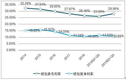 數(shù)據(jù)來(lái)源:公共資料整理 紙包裝2014-2019Q3毛利率及凈利率