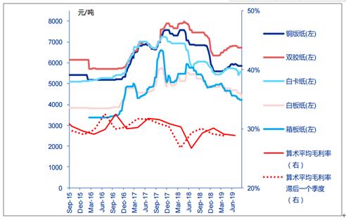 數(shù)據(jù)來(lái)源:公共資料整理 盈利能力改善系:1)原材料價(jià)格回落:2018Q2各紙種價(jià)格較高,2019Q2各紙種價(jià)格明顯同比回落(銅版紙、雙膠紙、白卡紙、白板紙、箱板紙同比下降19%、14%、13%、12%和20%),考慮到原材料庫(kù)存周期,2019Q3行業(yè)盈利能力有望繼續(xù)環(huán)比提升。2)行業(yè)整合話語(yǔ)權(quán)提升:紙包裝行業(yè)持續(xù)整合,如箱板瓦楞紙龍頭合興包裝訂單量逆勢(shì)持續(xù)增長(zhǎng),行業(yè)整合推動(dòng)行業(yè)盈利水平觸底回升。3)提升價(jià)值鏈附加:以紙包裝為載體為品牌商提供高附加值服務(wù),提升整體毛利率,例如吉宏股份以包裝為載體,跨界拓展精準(zhǔn)營(yíng)銷與跨境電商,實(shí)現(xiàn)線上廣告和線下包裝業(yè)務(wù)的深度融合。 紙包裝盈利能力變化與原材料價(jià)格走勢(shì)