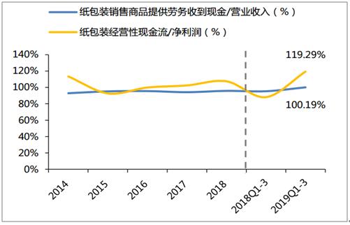 數(shù)據(jù)來(lái)源:公共資料整理 2019Q1-3紙包裝板塊實(shí)現(xiàn)銷售現(xiàn)金流306.60億元,同比+12.75%,銷售現(xiàn)金流/營(yíng)業(yè)收入同比+4.79pcpts至100.19%;實(shí)現(xiàn)經(jīng)營(yíng)性現(xiàn)金流39.04億元,同比+35.04%,經(jīng)營(yíng)性現(xiàn)金流/凈利潤(rùn)上升31.09pcpts至119.29%,現(xiàn)金流表現(xiàn)優(yōu)秀。 紙包裝2014-2019Q3現(xiàn)金流情況