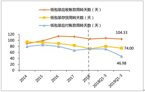 數(shù)據(jù)來(lái)源:公共資料整理 營(yíng)運(yùn)能力略有下降,總資產(chǎn)周轉(zhuǎn)天數(shù)同比上升10.99天至506.95天;其中應(yīng)收周轉(zhuǎn)天數(shù)下降2.73天至104.33天,存貨周轉(zhuǎn)天數(shù)下降6.14天至74.00天。應(yīng)付賬款周轉(zhuǎn)天數(shù)同比下降24.38天至46.98天。 紙包裝2014-2019Q3資產(chǎn)周轉(zhuǎn)天數(shù)