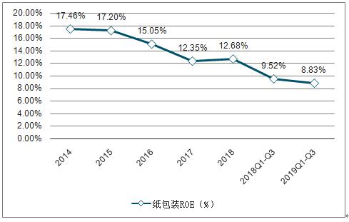 數(shù)據(jù)來(lái)源:公共資料整理 ROE在凈利率、資產(chǎn)周轉(zhuǎn)效率和權(quán)益乘數(shù)共同下降的作用下由去年同期的9.52%下滑至8.83%,同比降0.69pcpts。 紙包裝2014-2019Q3ROE