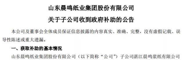 根據(jù)《企業(yè)會計準則 16 號—政府補助》的規(guī)定,與資產(chǎn)相關(guān)的政府補助,是指企業(yè)取得的、用于購建或以其他方式形成長期資產(chǎn)的政府補助;與收益相關(guān)的政府補助,是指除與資產(chǎn)相關(guān)的政府補助之外的政府補助。 而湛江晨鳴本次獲得的政府補助不用于購建或以其他方式形成長期資產(chǎn),故為與收益相關(guān)的政府補助。這也意味著,晨鳴紙業(yè)的稅前利潤將直接增加6089.40萬元。 值得一提的是,在今年5月5日,晨鳴紙業(yè)也曾發(fā)布過類似公告稱,湛江晨鳴收到湛江市麻章區(qū)財政局關(guān)于2019年廣東省工業(yè)企業(yè)技術(shù)改造事后獎補(第一批)資金共計人民幣3637.7萬元。 一番計算下來,在2019年,湛江晨鳴僅以上公開的兩筆政府補助,就已達到了9727.1萬元,金額不可謂不多。當?shù)卣畬Υ笮椭圃鞓I(yè)的重視程度,由此可見一斑。
