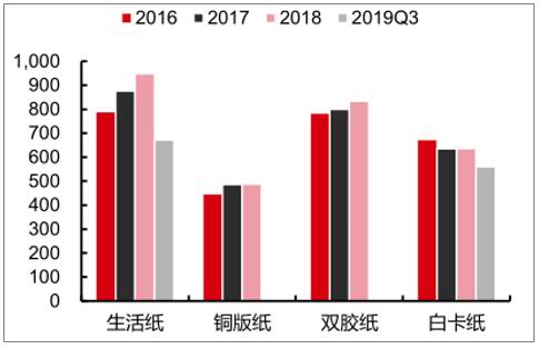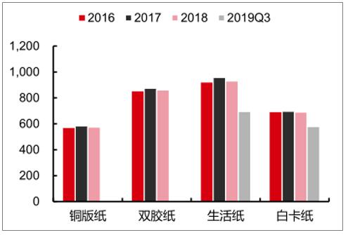 數(shù)據(jù)來源:公開資料整理 2016-2019Q1-3漿紙系主要紙品產(chǎn)量(萬噸)