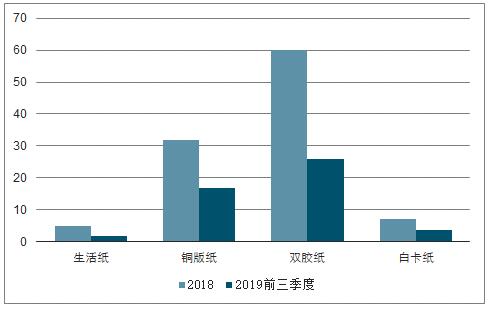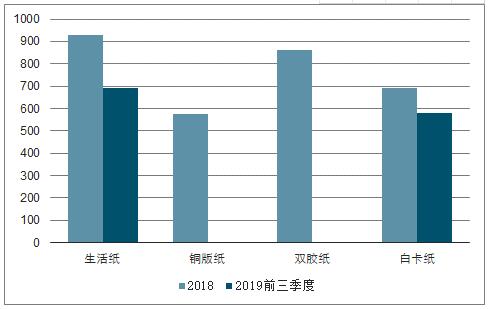 數(shù)據(jù)來源:公開資料整理 2018-2019前三季度生活紙、銅板紙、雙膠紙、白卡紙總產(chǎn)量(萬噸)