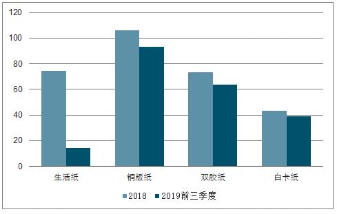 數(shù)據(jù)來源:公開資料整理 2018-2019前三季度生活紙、銅板紙、雙膠紙、白卡紙開工率