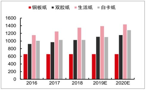 數(shù)據(jù)來源:公開資料整理 除銅版紙外,2016-2020年漿紙系主要紙種產(chǎn)能均持續(xù)擴(kuò)張。銅版紙生產(chǎn)格局集中,2018年CR4高達(dá)87.1%,過去3年無新增產(chǎn)能。其產(chǎn)量保持穩(wěn)定,2016-2018年CAGR僅為0.43%,開工率也維持在85%以上的高位,供需格局最為穩(wěn)定。而生活用紙、雙膠紙及白卡紙產(chǎn)能陸續(xù)釋放,2016-2018年產(chǎn)能CAGR分別為10.8%/5.40%/1.08%,均高于三者同期需求量CAGR(9.70%/3.24%/-2.70%),致使產(chǎn)量增長趨緩,開工率出現(xiàn)明顯下滑,分別-14.0pcts/-8.2pcts/-1.4pcts。預(yù)計2019-2020年生活用紙新增產(chǎn)能明顯放緩,加之需求穩(wěn)健增長,供需結(jié)構(gòu)有望逐步改善;白卡紙至2020年計劃新增產(chǎn)能255萬噸,有望彌補(bǔ)富陽地區(qū)214萬噸白紙板落后產(chǎn)能關(guān)停帶來的市場空白;文化紙方面,銅版紙雖無新增產(chǎn)能投放,但其需求彈性弱于雙膠紙,提價期間銅版紙價格落實情況整體不及雙膠。而雙膠紙潛在的130萬噸產(chǎn)能投放料將在長期對紙價造成壓力。 2016-2020E漿紙系主要紙品產(chǎn)能及預(yù)測(萬噸)