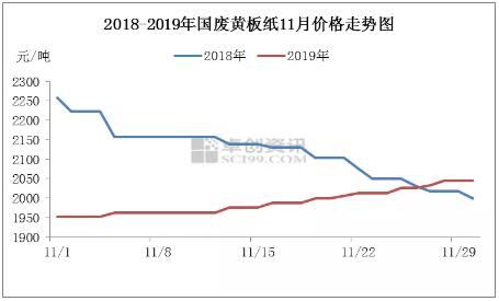 導語:國廢黃板紙價格在11月份因成品紙訂單量增加及市場貨源偏少而表現搶眼。但成品紙有需求前移的現象,后期缺乏繼續上漲的動力,且進入冬季后環保預警或有所增加。因此,卓創預計,12月國廢黃板紙價格先堅挺運行,后疲軟下滑。 價格回顧 自進入11月份以來,國廢黃板紙價格總體呈現堅挺向上的格局。如圖1所示,據卓創資訊監測數據顯示,11月國廢黃板紙均價為1989元/噸,月環比上漲2.59%,月同比下跌5.86%。