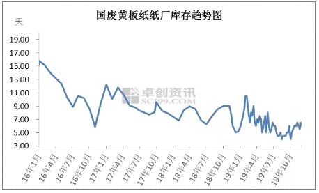 圖1 供需回顧 總體來看,11月份國廢黃板紙呈現供不應求的局面。以下是從供給跟需求兩個角度來分析具體的市場情況。 從供給的角度來看: 1.2019年11月5日,固廢中心公布了2019年第14批限制進口許可證顯示,審核通過了江蘇理文、山東世紀陽光等11家紙企共計42370噸的審批額度。前14批審核總量為1074.08萬噸,較2018年全年核定總量下降了40.84%。據海關統計,2019年10月我國廢紙進口總量73.65萬噸,環比減少10.11%,同比減少43.5%。1-10月份累計進口944.06萬噸,同比減少26.42%。 2.業者普遍反映市場貨源較為緊張,且雙十一之后貨量并未出現預期中的明顯增長。打包站回收量偏少,惜售氛圍較為濃厚,部分地區規模打包站存在囤貨現象。 3.11月份以來,紙廠爭相競價收購國廢黃板紙,市場出現搶貨現象。目前大型紙廠到貨量偏少,中小紙廠到貨情況較好。 從需求的角度來看: 1.四季度處于傳統的消費旺季,據卓創資訊數據監測,11月份瓦楞紙均價3358元/噸,較上月上漲62元/噸,環比上調1.88%,同比下滑11.24%。11月份瓦楞紙市場交投氣氛尚可,價格繼續呈現上漲態勢。其中規模紙企共提價兩輪,上漲金額在50-130元/噸;而中小紙企漲價更為積極,多數紙企調價3-4輪,主流上漲幅度在200元/噸左右,漲后價格基本高于周邊規模紙企報價。 2.如圖2所示,據卓創資訊數據監測,11月廢舊黃板紙廠庫存天數平均為6.23天,環比上升15.66%,紙廠的備貨積極性整體較高。 3.中美關系暫時緩和,有利于成品紙銷售。