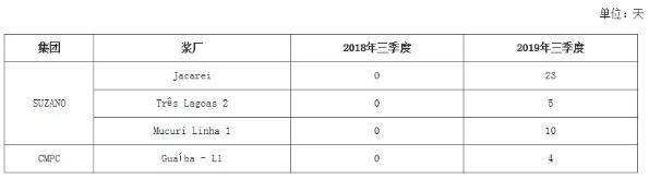 去產量 漿廠檢修時間增加 巴西統(tǒng)計部門公布數(shù)據(jù)顯示,2019年三季度巴西木漿產量501.90萬噸,環(huán)比下降1.53%,同比下降7.82%。產量同環(huán)比均下降,主要是受到Suzano公司主動降產量,2019年5月5日Suzano發(fā)布公告計劃減產紙漿年產量100萬噸以上,從圖1也可以看出,發(fā)布公告后各月的產量均較去年同期出現(xiàn)下滑。表1所示的是漿廠的檢修時間,2018年三季度巴西主要漿廠沒有檢修情況,而今年三季度檢修時間達到42天,且主要集中在Suzano旗下的漿廠。經過漿廠主動降產量后,三季度Suzano紙漿產量209.5萬噸,同比下降24%,環(huán)比下降6%;CMPC紙漿產量106.6萬噸,同比下降1%,環(huán)比下降2%。 表1 巴西漿廠檢修情況