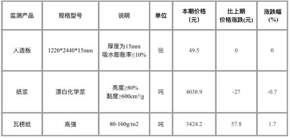 國家統計局中國經濟景氣監測中心表示:據對24個省(區、市)流通領域9大類50種重要生產資料市場價格的監測,2019年11月下旬與11月中旬相比,林產品領域的三類產品中,人造板價格持平,瓦楞紙價格上漲,紙漿價格下跌。 2019年11月下旬林產品領域重要生產資料市場價格變動情況