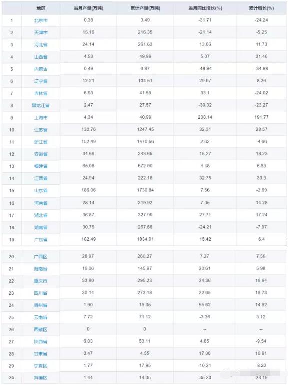 (30個省市在1-10月份的機制紙及紙板產量) 10月份機制紙及紙板產量過百萬噸的省份共有4個 在10月份,機制紙和紙板產量過百萬噸的省份共有四個,分別為山東、廣東、浙江、江蘇,其中: 位居首位的是山東省,10月份機制紙和紙板產量為186.06萬噸,同比增長7.56%; 緊隨其后的是廣東省,10月份機制紙和紙板產量為182.49萬噸,同比增長15.42%; 排名第三的是浙江省,10月份機制紙和紙板產量為152.49萬噸,同比增長2.62%; 排名第四的是江蘇省,10月份機制紙和紙板產量為130.76萬噸,同比增長32.31%。 除了以上四個省份之外,10月份機制紙和紙板產量過50萬噸的僅有福建省,產量為65.08萬噸,同比增長4.48%。 而產量在10-50萬噸之間的省市共有12個,分別為湖北(36.87萬噸)、安徽(34.69萬噸)、湖南(30.76萬噸)、重慶(33.80萬噸)、四川(30.14萬噸)、廣西(28.97萬噸)、河南(28.14萬噸)、江西(24.94萬噸)、河北(24.14萬噸)、海南(16.06萬噸)、天津(15.16萬噸)、遼寧(12.21萬噸)。 產量在10萬噸以下的省市共有13個,分別為云南(7.72萬噸)、吉林(6.93萬噸)、陜西(6.03萬噸)、山西(4.53萬噸)、上海(4.34萬噸)、黑龍江(2.47萬噸)、貴州(1.90萬噸)、寧夏(1.77萬噸)、新疆(1.44萬噸)、內蒙古(0.49萬噸)、甘肅(0.47萬噸)、北京(0.38萬噸)、西藏(0萬噸)。 廣東在1-10月份的機制紙及紙板產量居全國首位 由此也可以看出,我國的機制紙和紙板企業主要集中于華東及華南地區,其次則是華中、華北以及西南、東北等地。四個造紙大省的產量總和比其他所有省份的總和還要多,這一現象在1-10月份的累計產量中更為明顯。 據整理,1-10月機制紙和紙板產量過千萬噸的也是山東、廣東、浙江、江蘇四省,不過排位順序有所變動: 排名居首的是廣東省,1-10月份機制紙和紙板產量為1834.91萬噸,同比增長6.4%; 緊隨其后的是山東省,1-10月份機制紙和紙板產量為1730.84萬噸,同比減少2.69%; 排名第三的是浙江省,1-10月份機制紙和紙板產量為1470.56萬噸,同比減少4.66%; 排名第四的是江蘇省,1-10月份機制紙和紙板產量為1247.45萬噸,同比增長28.57%。 同樣,除了以上四個省份外,1-10月份機制紙和紙板產量過500萬噸的僅有福建省,產量為672.90萬噸,同比增長5.63%。 而1-10月份累計產量在100-500萬噸的省市也是12個,分別為安徽(343.65萬噸)、湖北(327.99萬噸)、河南(319.92萬噸)、重慶(295.23萬噸)、四川(273.18萬噸)、湖南(267.66萬噸)、河北(261.63萬噸)、廣西(260.27萬噸)、江西(222.18萬噸)、天津(216.35萬噸)、海南(145.97萬噸)、遼寧(104.51萬噸)。 其余省市1-10月的累計產量均在100萬噸以下,不再具體列出數據。值得一提的是,上海地區的產量累計增長速度最高,達到191.77%,其次是山西,累計增幅也達到了31.46%,這必然與當地的新增產能有關。