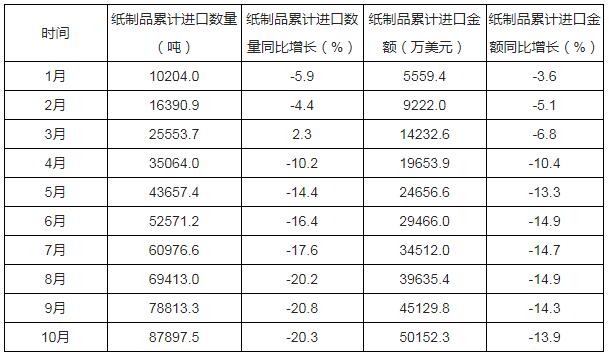 2019年1-10月中國紙制品進口數量及進口金額統計表