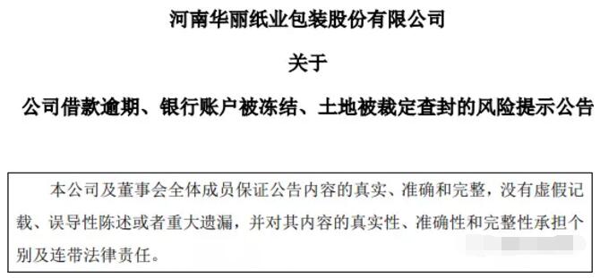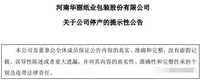 自2016年以來持續(xù)虧損,河南華麗紙業(yè)包裝股份有限公司(下稱:華麗包裝)正遭遇一系列危機(jī):流動資金匱乏、銀行貸款逾期、銀行賬戶被凍結(jié)、土地相繼被法院裁定查封、公司及公司實際控制人被列入失信被執(zhí)行人…… 由于難以在短時間內(nèi)改善困難狀況,1月10日,華麗包裝發(fā)布公告稱,決定在現(xiàn)有尾單根據(jù)資金配置情況生產(chǎn)完畢后實施停產(chǎn),待外部資金及業(yè)務(wù)合作能夠取得實質(zhì)性進(jìn)展后,再適時恢復(fù)生產(chǎn)。