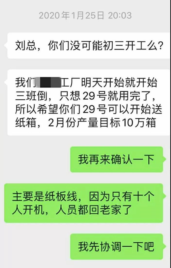 大年初一:客戶告急,萬國應急響應 大年初一,醫藥客戶通知其將于1.27日(正月初三)由原先的一條生產線緊急調整為3條生產線生產,紙箱庫存告急。 責任重于泰山,在全國新型冠狀病肺炎防控關鍵階段,我們有責任和義務在此刻配合醫藥企業,完成疫情所需藥品生產任務,提供配套服務,我司領導班子積極行動,成立包括總經理、生產副總、銷售副總、以及工藝部、采購部、設計部、銷售負責人在內的醫藥紙箱應急響應群,希望調動公司一切資源配合客戶的供貨。 正月初二:緊急調動生產人員,及時采購防控物資 由于公司多為外地員工,新春佳節,大家都已回老家團聚,蘇州當地只有一人留守。生產副總李紅俊制定人員緊急預案,及時聯系可到位生產人員,并發動非湖北籍關鍵崗位員工,是否有自愿來公司支援生產。 人事經理吉花冒雨奔走各大藥店采購防控物資,送到公司,為復工做前期準備工作。 正月初三:蘇州市園區政府批準復工 客戶給公司開了證明,管理層積極聯絡政府人員申請復工,征得當地政府批準。 正月初四:順利復工 致敬這些可愛又可敬的萬國同事們,接到工廠臨時通知后,舍棄春節休假時間。非湖北籍員工在確保體溫正常的情況下連夜從外地趕回,從而保證產線順利開展。