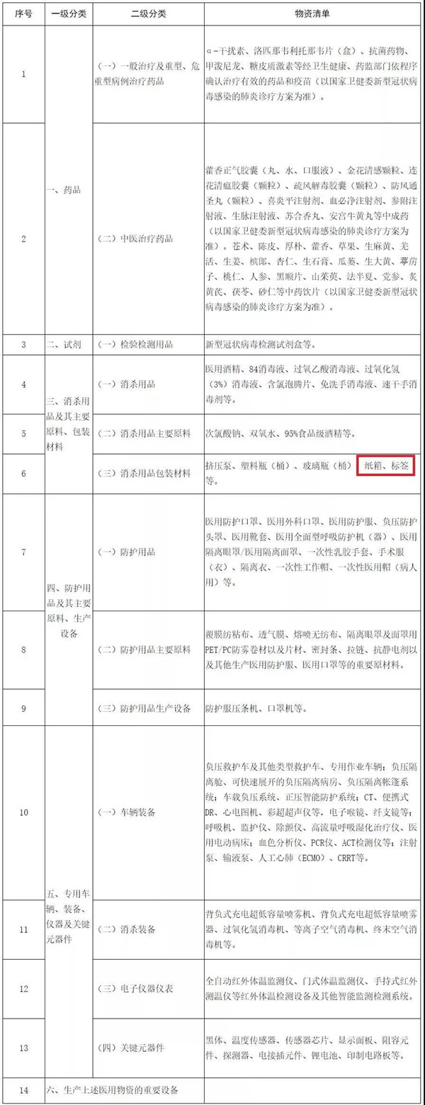 作為保障疫情防控物資生產的重要配套物資“紙箱、標簽”也被列入清單中,及時解決了疫情用紙箱的生產、運輸的恢復和開展工作。