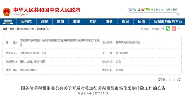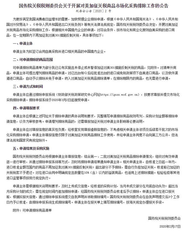 2月18日,國務(wù)院關(guān)稅稅則委員會發(fā)布公告稱,將開展對美加征關(guān)稅商品市場化采購排除工作,根據(jù)相關(guān)中國境內(nèi)企業(yè)的申請,對符合條件、按市場化和商業(yè)化原則自美采購的進(jìn)口商品,在一定期限內(nèi)不再加征對美301措施反制關(guān)稅。