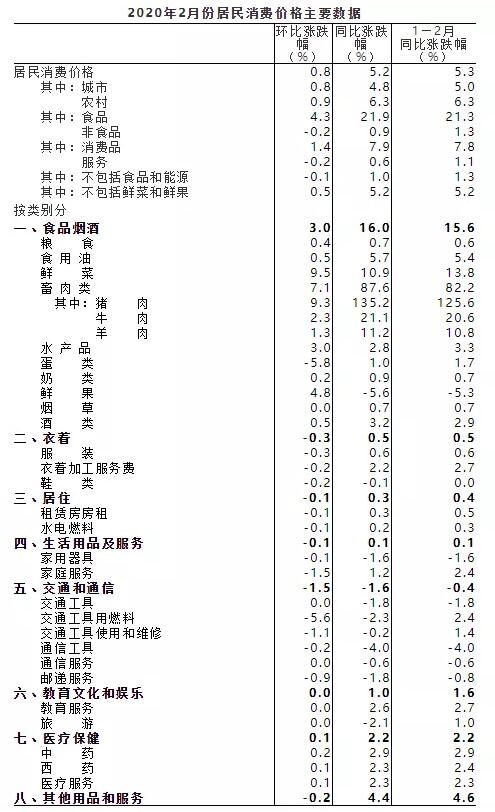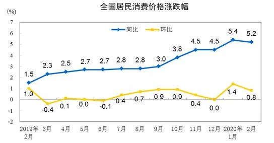 雖然疫情導致全國經濟大停擺近兩個月,但據國家統計局數據統計,2020年2月,全國居民消費價格同比上漲5.2%。 其中,城市上漲4.8%,農村上漲6.3%;食品價格上漲21.9%,非食品價格上漲0.9%;消費品價格上漲7.9%,服務價格上漲0.6%。1??—2月平均,全國居民消費價格比去年同期上漲5.3%。 2月份,全國居民消費價格環比上漲0.8%。其中,城市上漲0.8%,農村上漲0.9%;食品價格上漲4.3%,非食品價格下降0.2%;消費品價格上漲1.4%,服務價格下降0.2%。