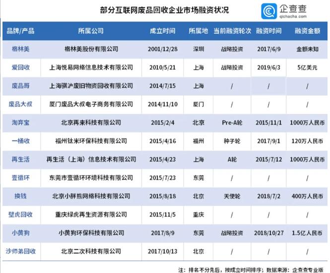 廢品回收行業(yè)向來都會被貼上“臟亂差”的標(biāo)簽,不過與這些標(biāo)簽不匹配的是,廢品回收行業(yè)市場規(guī)模過萬億,發(fā)展前景不可小覷。 令人不解的是,規(guī)模如此可觀的廢品回收行業(yè)為何至今仍混亂無序?原因主要有兩個: 首先,廢品回收產(chǎn)業(yè)鏈?zhǔn)恰邦^輕腳重”的金字塔型模型。處于金字塔最底端的廢品處理和再生企業(yè)居多,而專干臟活累活的上游回收環(huán)節(jié)卻由大量散戶及小型回收站掌控,這就造成了廢品回收行業(yè)不規(guī)范、監(jiān)管難的局面。 其次,相比于歐美市場60%的回收利用率,國內(nèi)目前尚未達(dá)到25%,這也就意味著,廢品回收產(chǎn)業(yè)尚處在“散兵游勇”階段,具有明顯的小、散、差等特點,粗放式經(jīng)營更是大大減弱了傳統(tǒng)廢品回收企業(yè)和從業(yè)人員抵御風(fēng)險的能力。 但這并不能阻礙創(chuàng)業(yè)者利用互聯(lián)網(wǎng)工具對廢品回收行業(yè)進(jìn)行改造。 相比傳統(tǒng)模式,“互聯(lián)網(wǎng)+廢品回收”有不少優(yōu)勢,比如互聯(lián)網(wǎng)廢品回收平臺可以打破信息孤島,能夠鏈接起全產(chǎn)業(yè)的各個環(huán)節(jié),是對傳統(tǒng)廢品回收行業(yè)的升級和轉(zhuǎn)型。 根據(jù)“某企業(yè)信息查詢平臺”專業(yè)版數(shù)據(jù)查詢到的12家互聯(lián)網(wǎng)廢品回收企業(yè)中,其中有1家為上市公司,7家披露了市場融資狀況。但從融資次數(shù)和融資金額上看,互聯(lián)網(wǎng)廢品回收企業(yè)似乎并沒有受到資本方的青睞。
