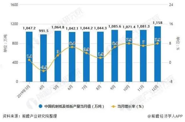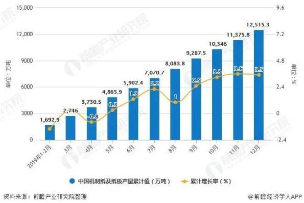 2019我國機制紙及紙板產量超1.25億 根據國家統計局數據顯示,2018年全年中國機制紙及紙板(外購原紙加工除外)產量累計達到了11660.6萬噸,累計下降1.5%。截止至2019年12月,中國機制紙及紙板(外購原紙加工除外)產量為1158萬噸,同比增長7.9%。累計方面,2019年1-12月中國機制紙及紙板(外購原紙加工除外)產量達到12515.3萬噸,累計增長3.5%。 2019年1-12月中國機制紙及紙板產量當月值統計及增長情況