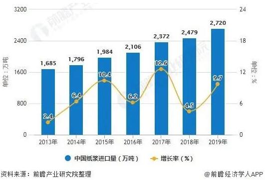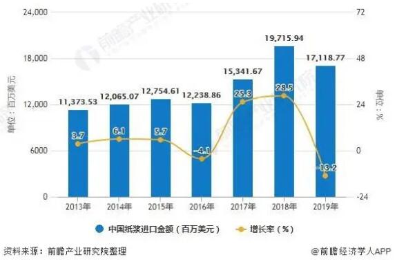 2019我國紙漿進口量超2700萬噸 據中國海關總署統計數據顯示,2018年中國紙漿進口數達到了2479萬噸,累計增長4.5%。截止至2019年12月中國紙漿進口量為218萬噸,同比增長23.2 %。累計方面,2019年1-12月中國紙漿進口量達到2720萬噸,累計增長9.7%。 在進口金額方面,2018年中國紙漿進口金額達到了19715937千美元(19715.94百萬美元),累計增長28.5%。截止至2019年12月中國紙漿進口金額為1130607千美元(1130.61百萬美元)。累計方面,2019年1-12月中國紙漿進口金額達到17118772千美元(17118.77百萬美元),累計下降13.2%,進口均價為6293.67千美元/萬噸。 2013-2019年中國紙漿進口量統計及增長情況