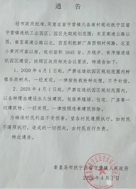 2020年4月1日起,嚴禁在造紙園區規劃范圍內,以各種理由建設永久性建筑,包括養殖場、住宅、廠房等一切建筑物。一經發現,一律按照違章建筑拆除。
