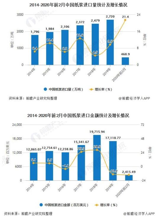 據中國海關總署統計數據顯示,2019年去年中國紙漿進口量達到了2720萬噸,累計增長9.7%。截止至2020年1-2月中國紙漿進口量達到468.9萬噸,相比上年同期增長了83萬噸,累計增長21.4%。