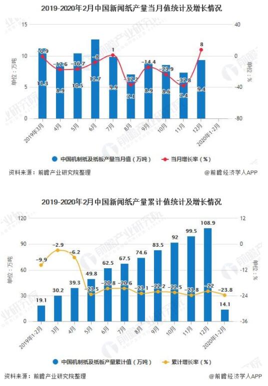 據國家統計局數據顯示,2019年全年中國新聞紙產量達到了108.85萬噸,累計下降22%。截止至2020年1-2月中國新聞紙產量達到14.1萬噸,累計下降23.8%。