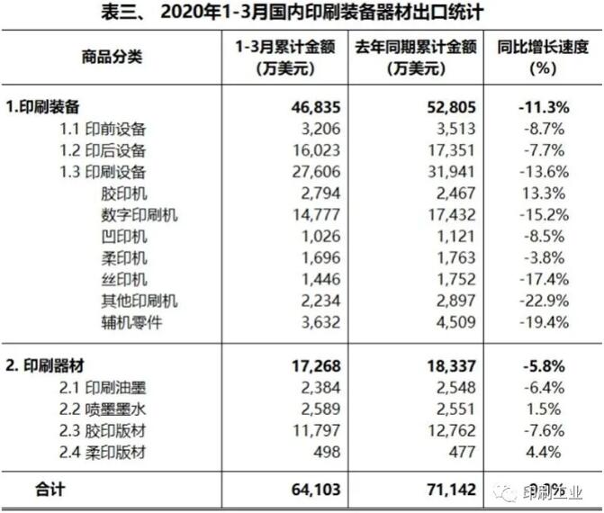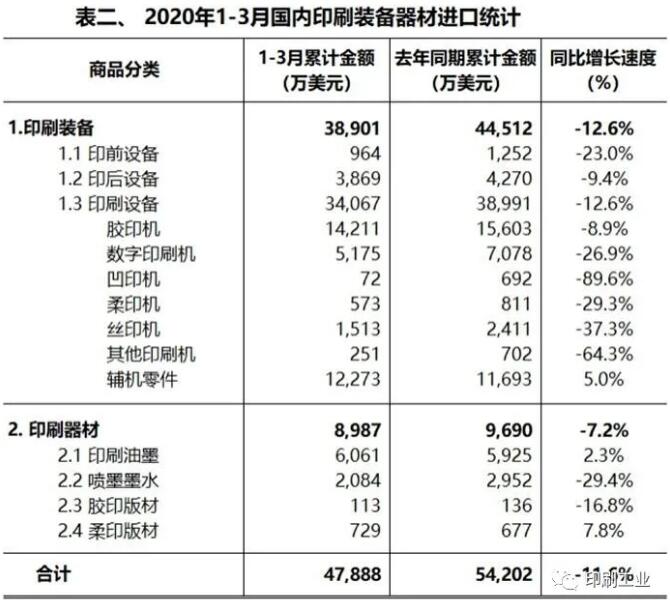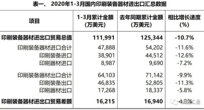 2020一季度國內印刷、裝備器材進出口簡報