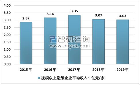 資料來源:國家統(tǒng)計局、智研咨詢整理 2017年,我國規(guī)模以上造紙企業(yè)主營業(yè)務(wù)平均收入達到峰值的3.35億元/家,隨后兩年開始不同程度的下降,截至2019年,國內(nèi)規(guī)模以上造紙企業(yè)主營業(yè)務(wù)平均收入下降至3.03億元/家。 2015-2019年中國規(guī)模以上造紙企業(yè)平均收入走勢圖