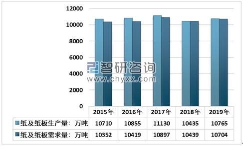 2019年全國紙及紙板生產(chǎn)量10765萬噸,相比2018年的10435萬噸,增長3.16%。消費量10704萬噸,同比增長2.54%。 2015-2019年中國紙及紙板生產(chǎn)和消費情況