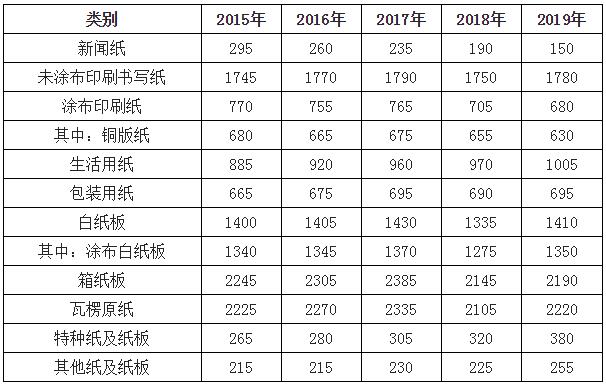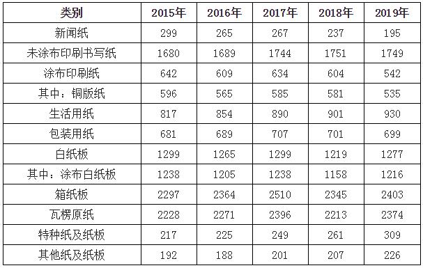 銅版紙消費量535萬噸,較上年下降7.92%;涂布印刷紙消費量542萬噸,較上年下降10.26%;未涂布印刷書寫紙消費量1749萬噸,較上年下降0.11%;新聞紙消費量195萬噸,較上年下降17.72%;生活用紙消費量930萬噸,較上年增長3.22%;包裝用紙消費量699萬噸,較上年下降0.29%;白紙板消費量1277萬噸,較上年增長4.76%;其中,涂布白紙板消費量1216萬噸,較上年增長5.01%;箱紙板消費量2403萬噸,較上年增長2.47%;瓦楞原紙消費量2374萬噸,較上年增長7.28%;特種紙及紙板消費量309萬噸,較上年增長18.39%。 2015-2019年中國紙及紙張細分產(chǎn)品消費情況單位:萬噸
