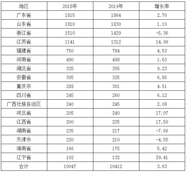 2019年廣東、山東、浙江、江蘇、福建、河南、湖北、安徽、重慶、四川、廣西、河北、江西、湖南、天津、海南和遼寧17個。▍^(qū)、市)紙及紙板產(chǎn)量超過100萬噸,產(chǎn)量合計10412萬噸,占全國紙及紙板總產(chǎn)量的96.72%。 2019年紙及紙板產(chǎn)量100萬噸以上的省(區(qū)、市)單位:萬噸